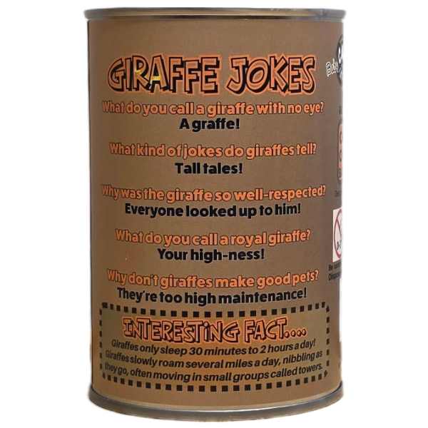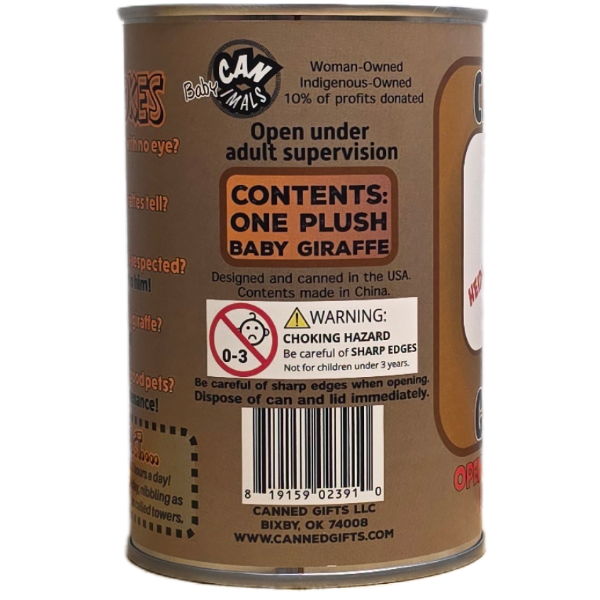 Included is 1 plush baby giraffe sealed in a can. Your choice of lid style: regular (open with a can opener), pop top, or foil.