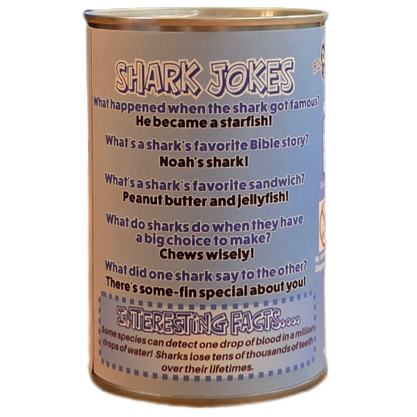 Funny shark jokes and interesting facts on the can.