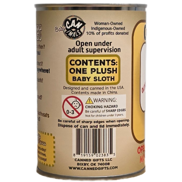 Included is 1 plush baby sloth sealed in a can. Your choice of lid style: regular (open with a can opener), pop top, or foil.