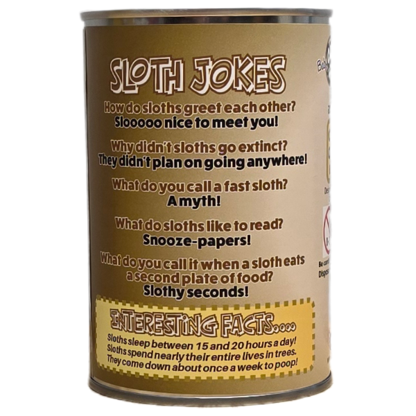 Funny sloth jokes and interesting facts on the can.