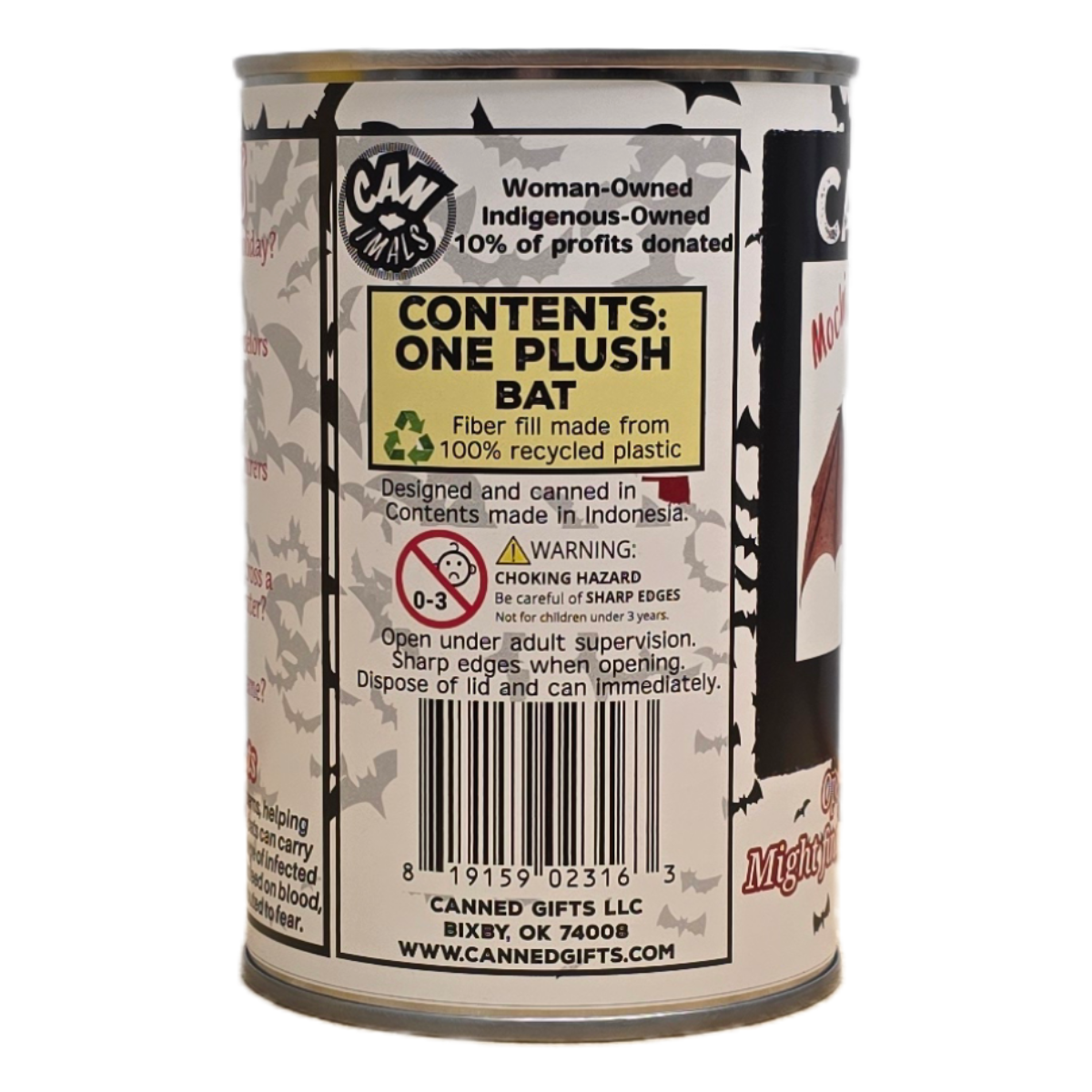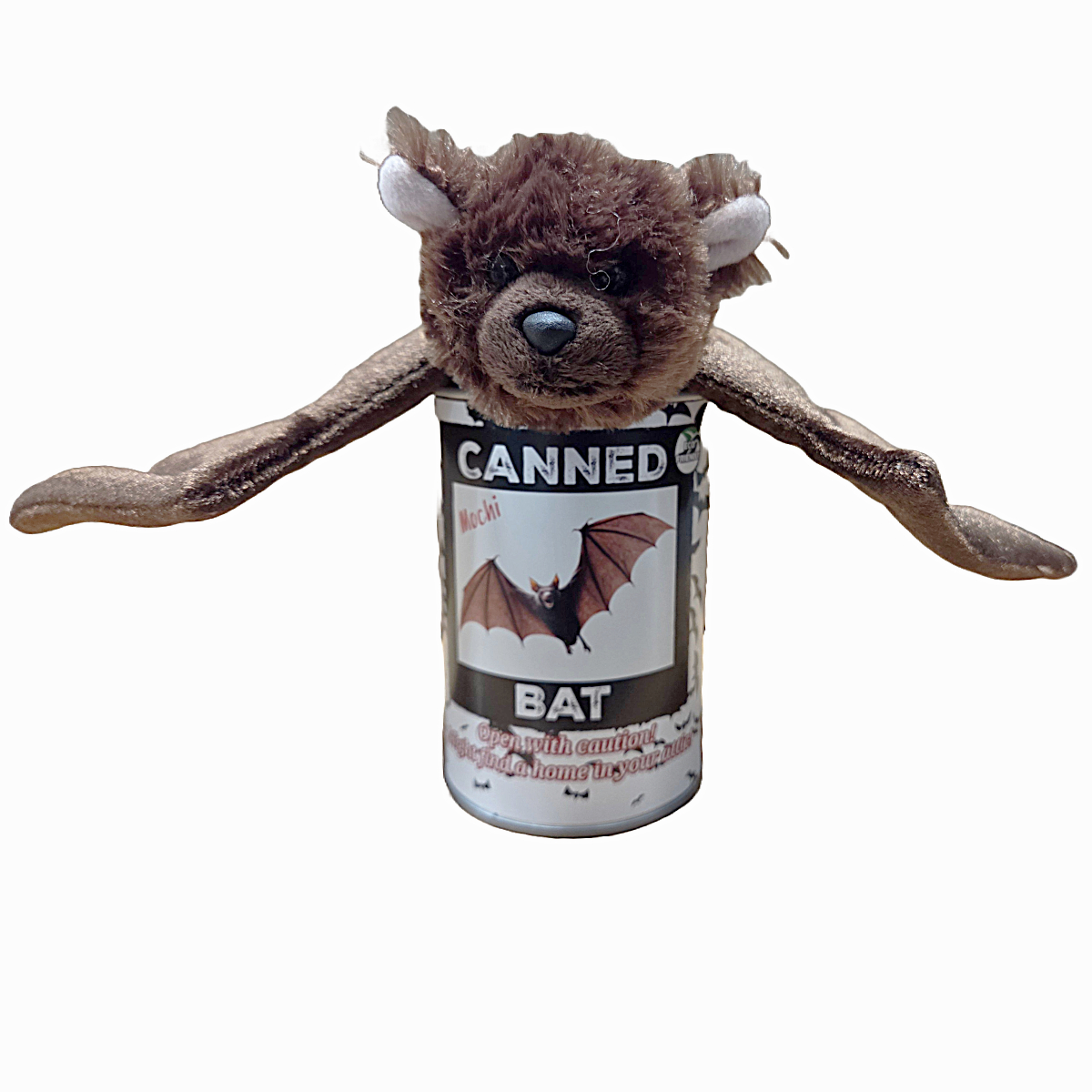 • Bat plush sealed in a can. Choose your lid style: standard, pop, or foil.