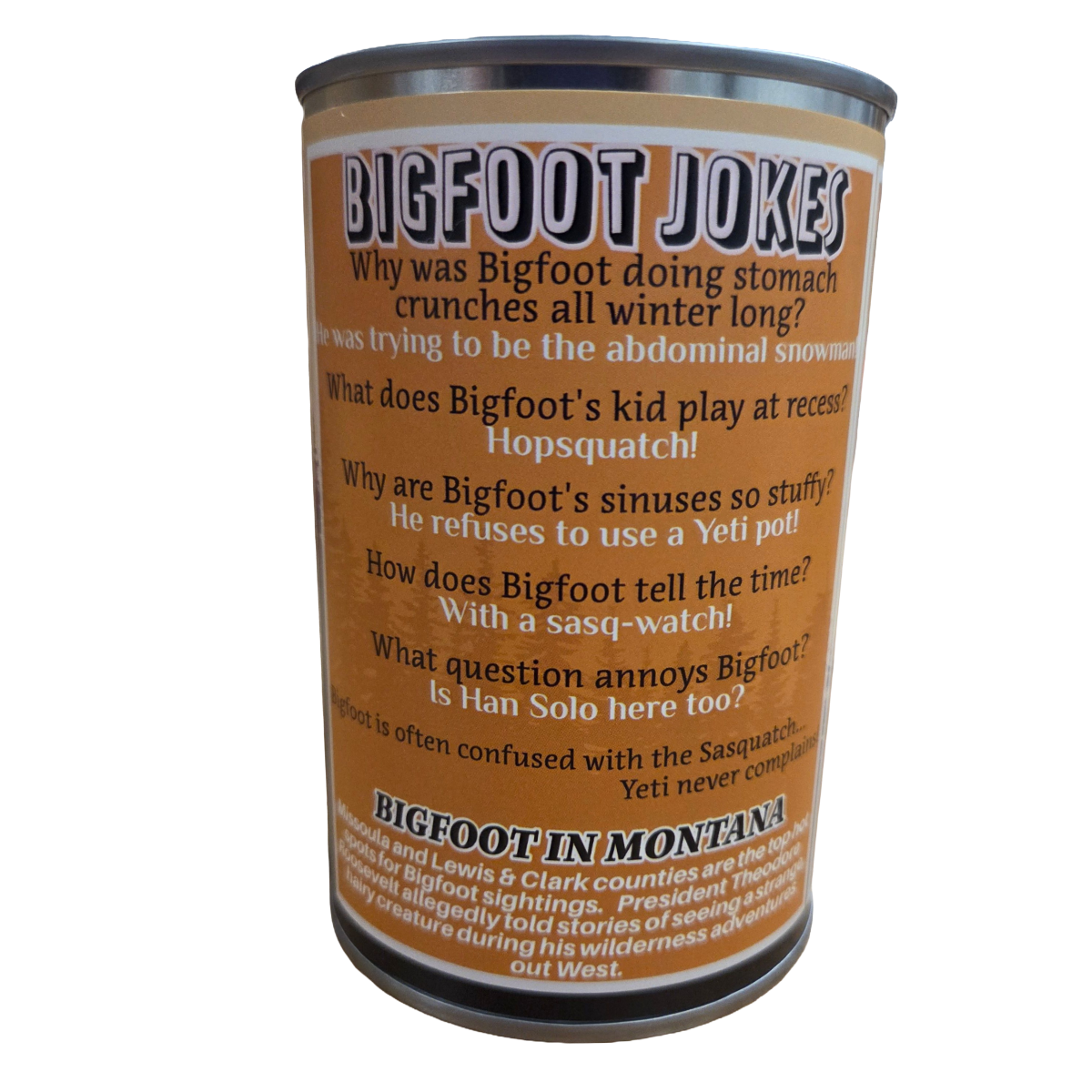 • Funny bigfoot jokes and interesting facts about the Montana Bigfoot on the can.