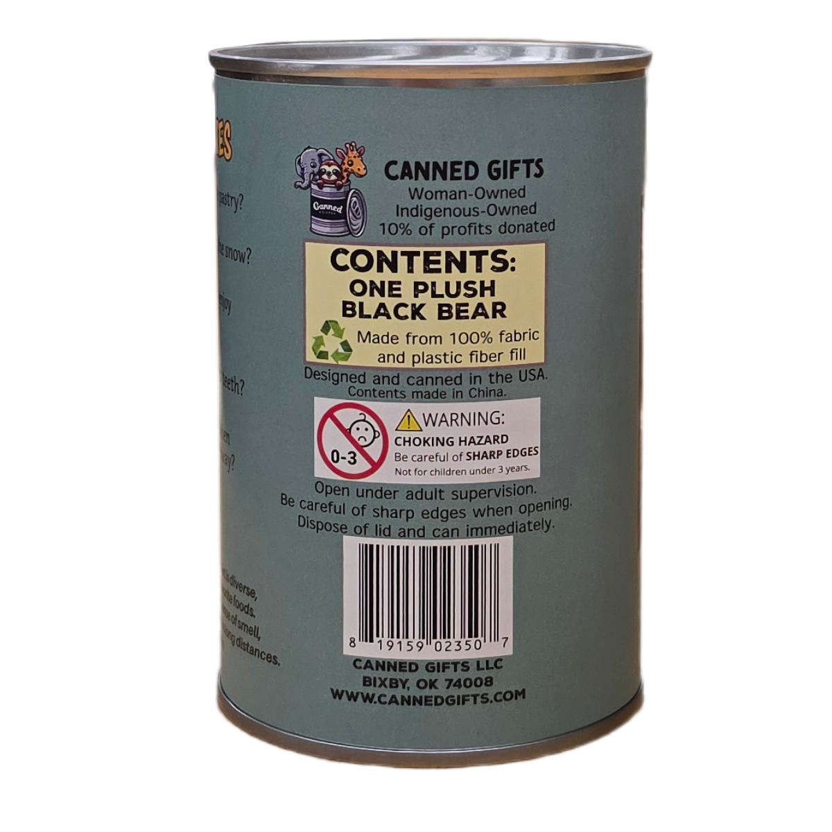 • Black Bear plush sealed in a can. Your choice of lid style: standard, pop top, or foil.