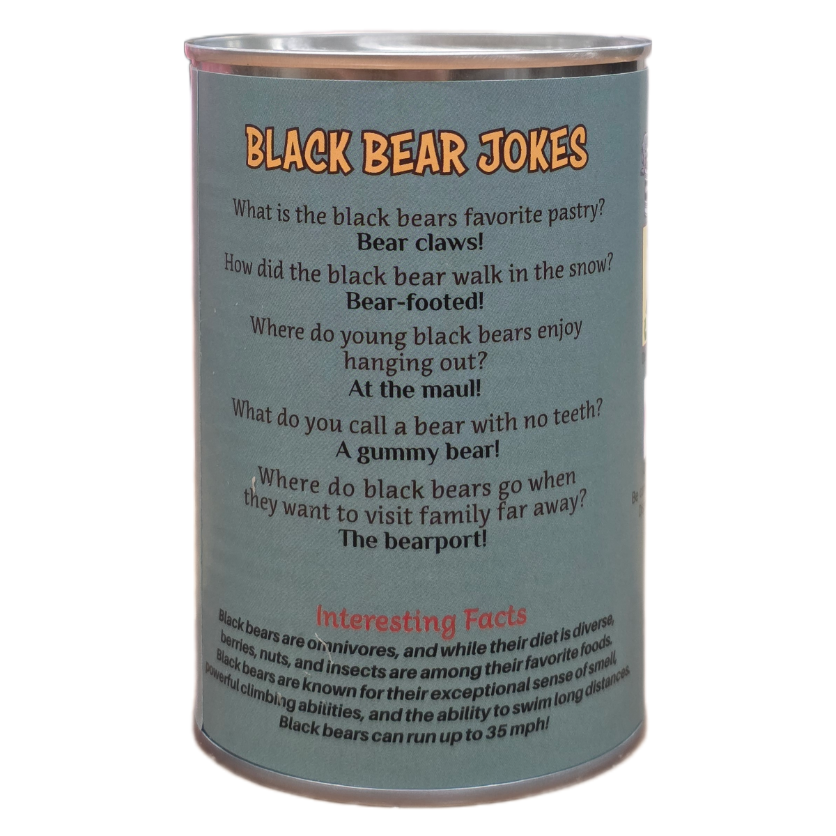 • Funny Black Bear jokes and an interesting fact on the can.