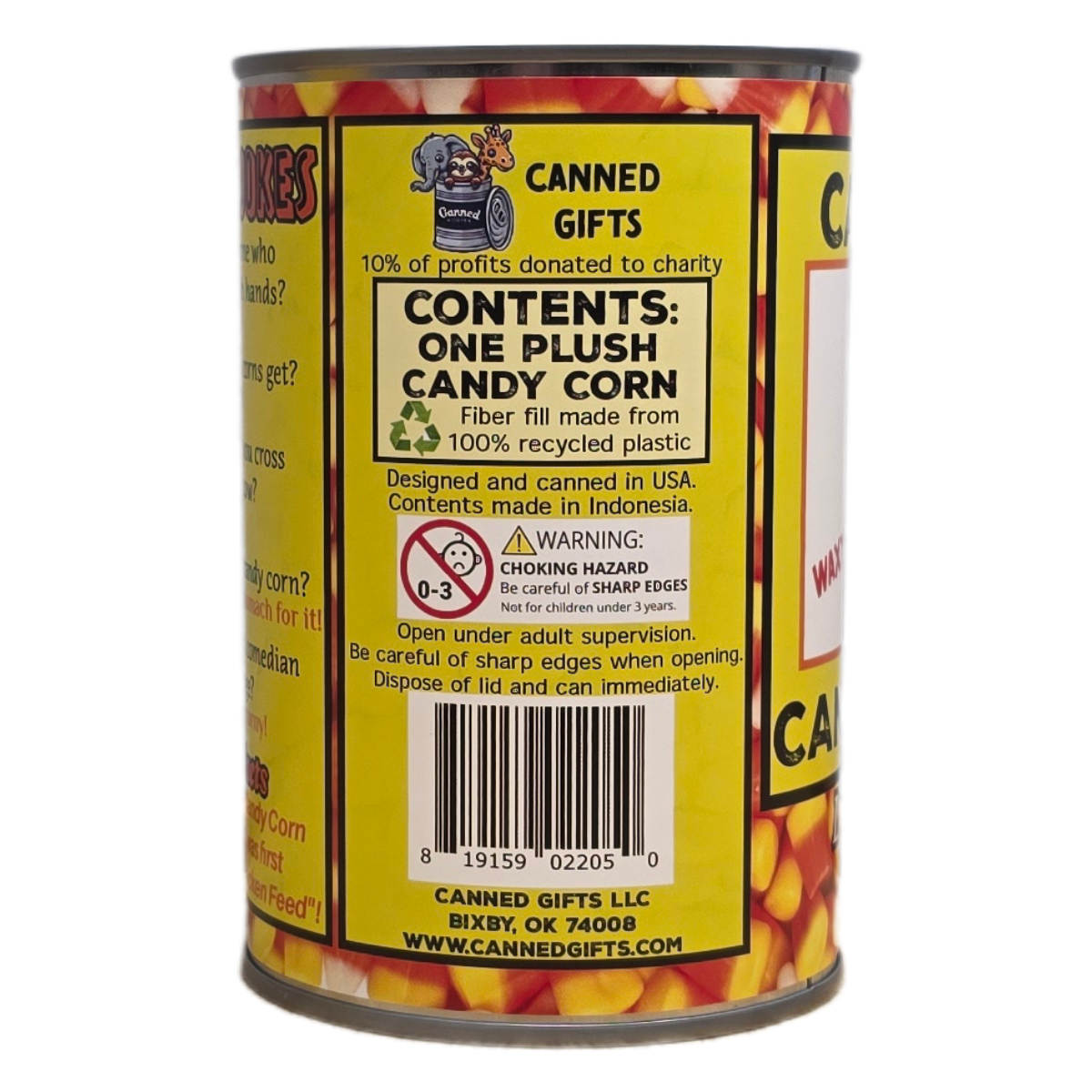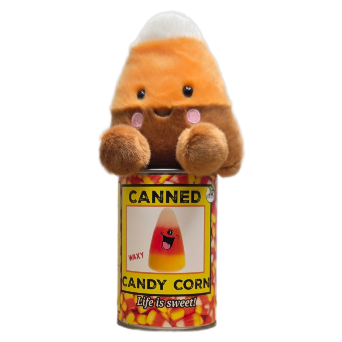 • Candy Corn plush sealed in a can. Choose your lid style: standard, pop top, or foil lid.