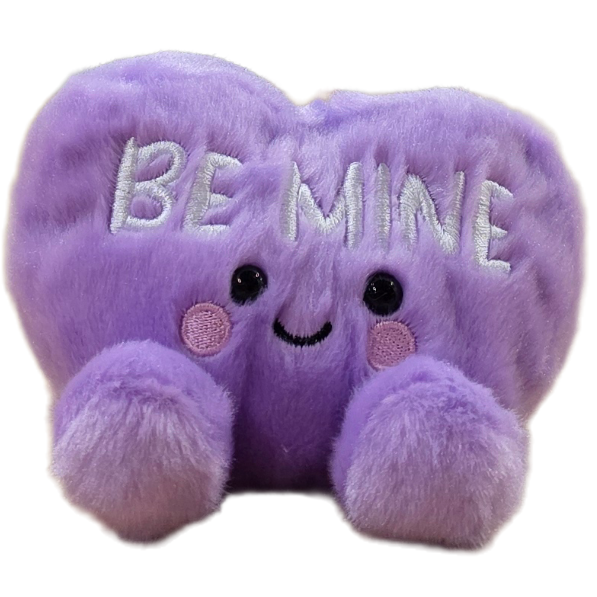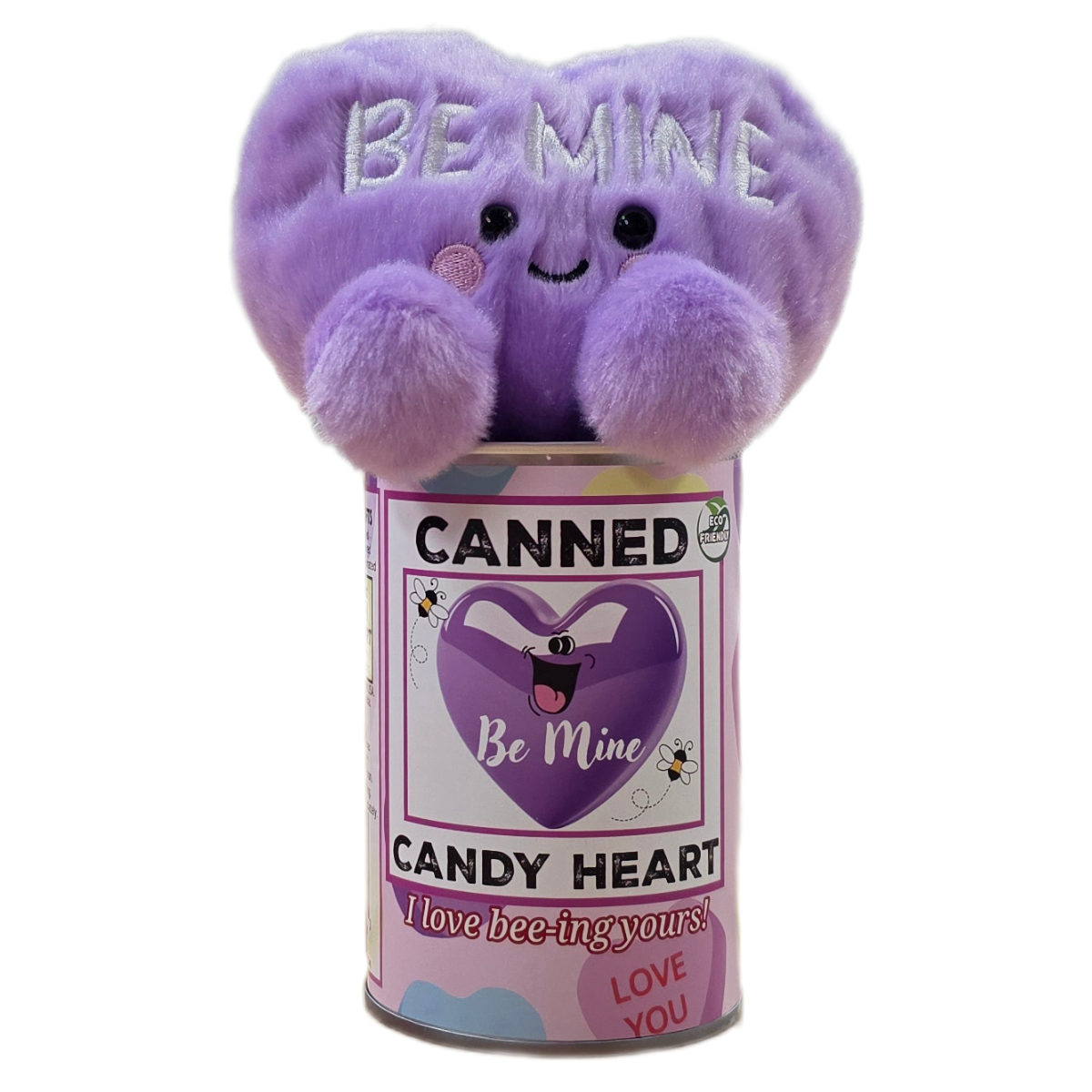• Purple candy heart ‘Be Mine’ plush sealed in a can. Use a can opener to open the fun gift or choose the pop top lid!