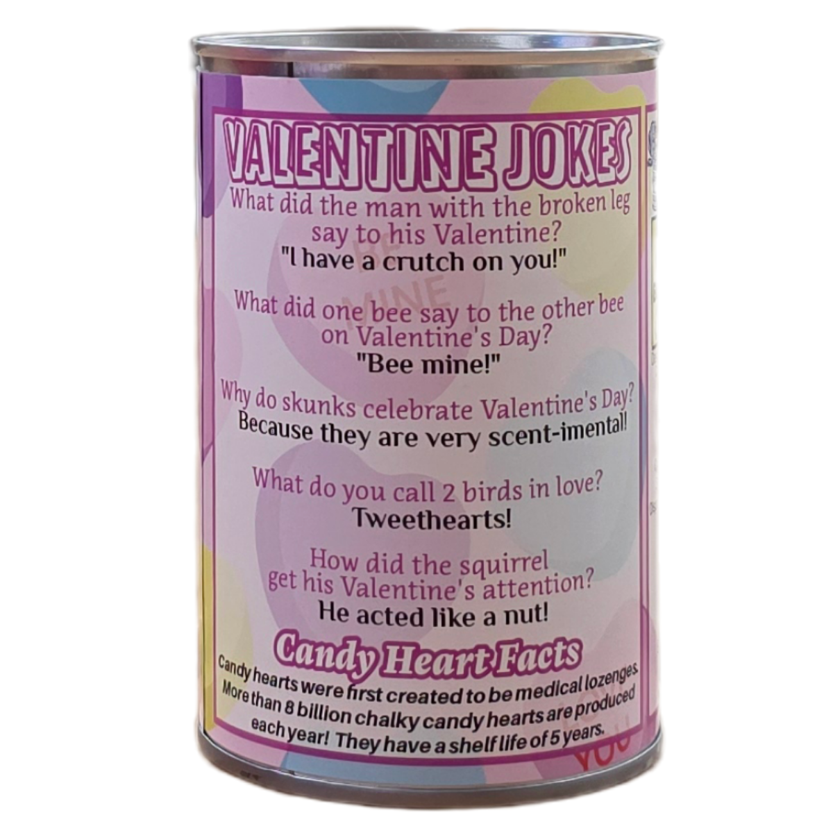 • Funny Valentine’s jokes and an interesting fact on the can.