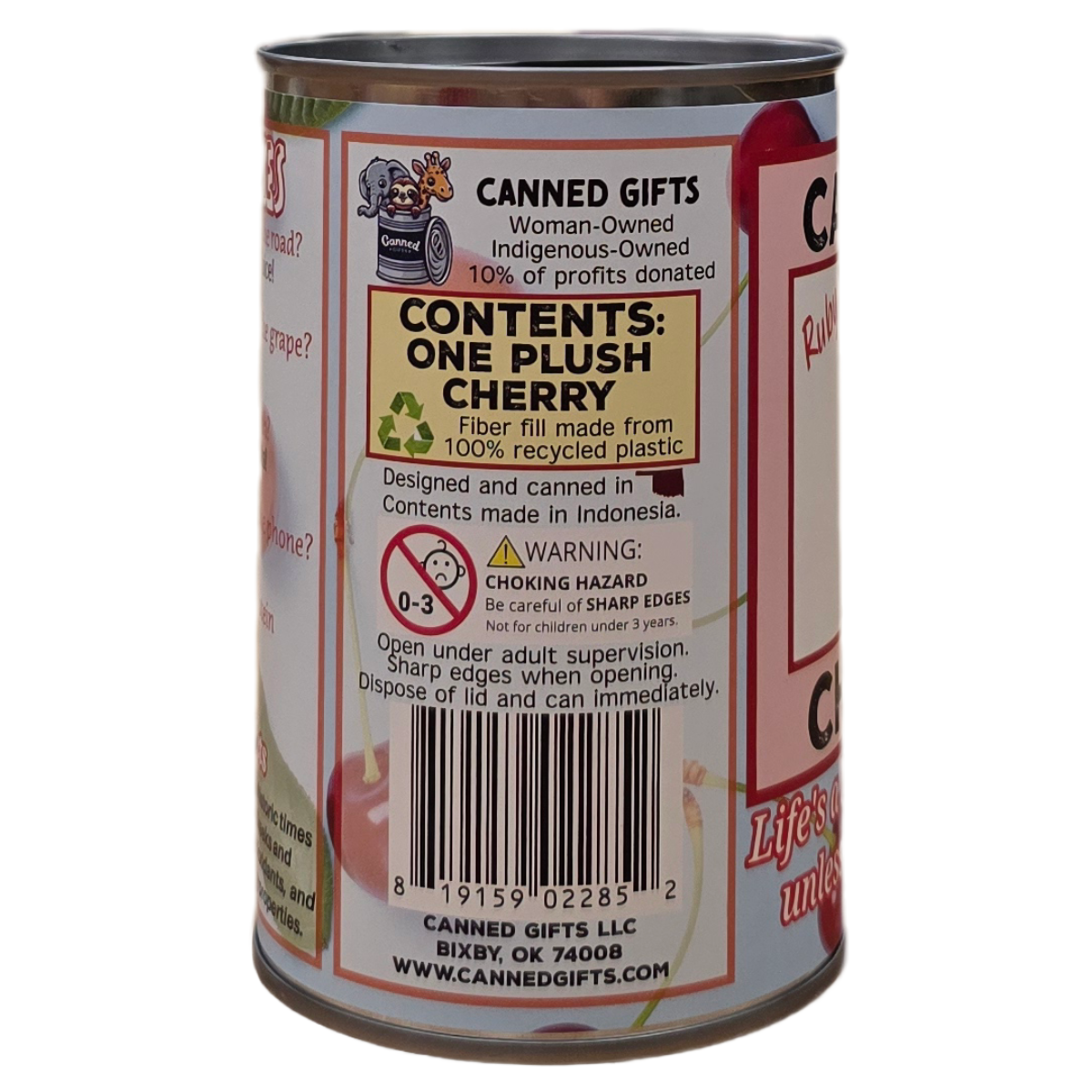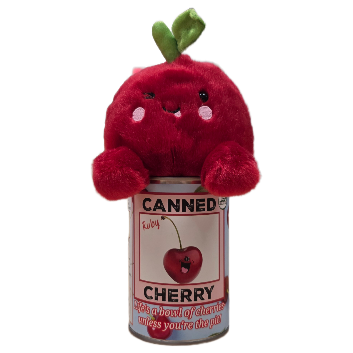 • Cherry plush sealed in a can. Choose your lid style: standard, pop top, or foil.
