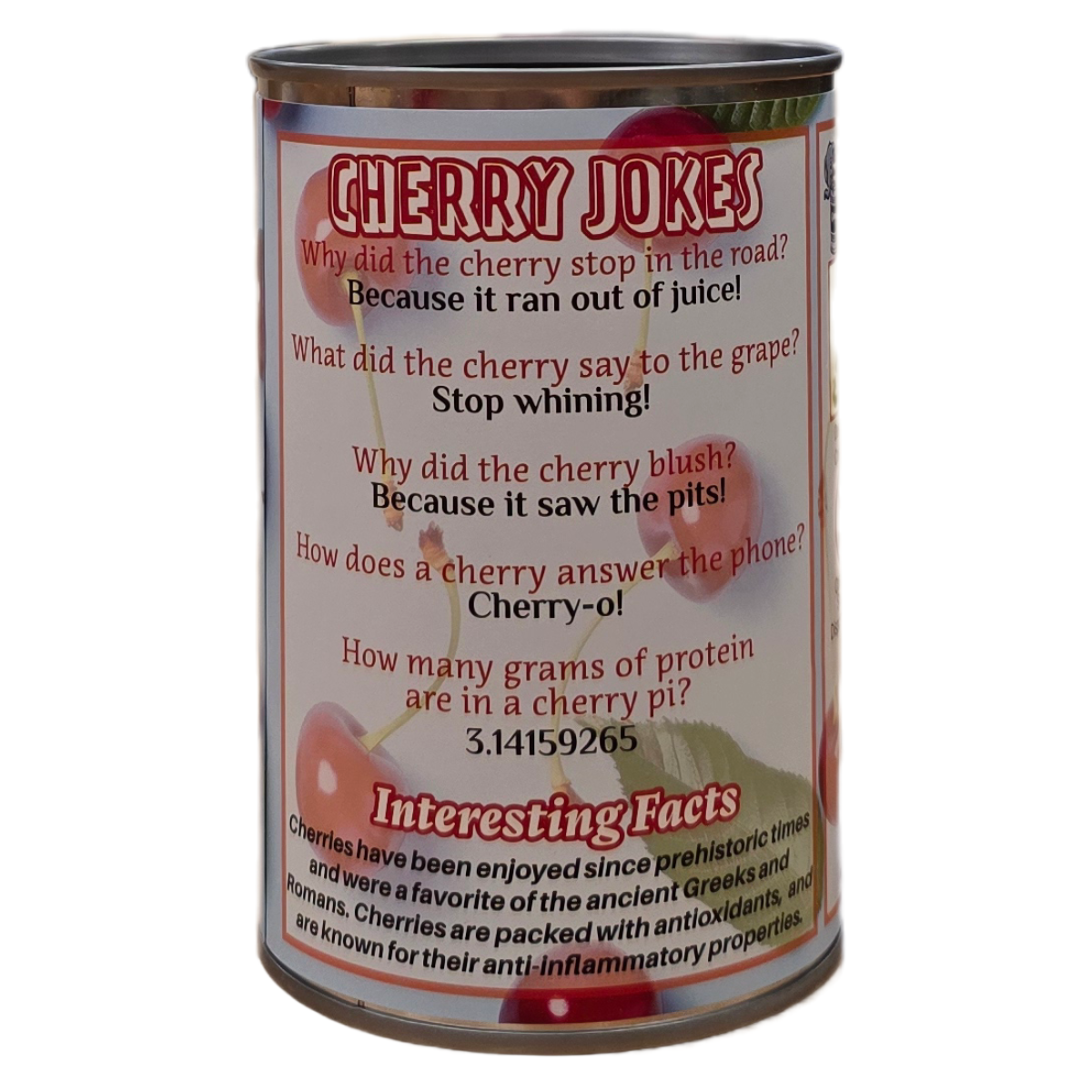 • Funny cherry jokes and interesting facts on the can.