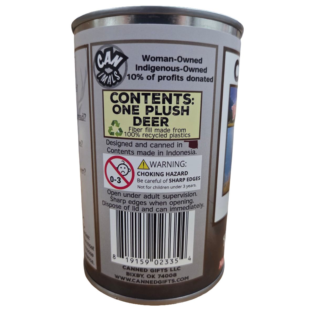 • Plush deer sealed in a can. Your choice of lid style: regular, pop top, or foil.