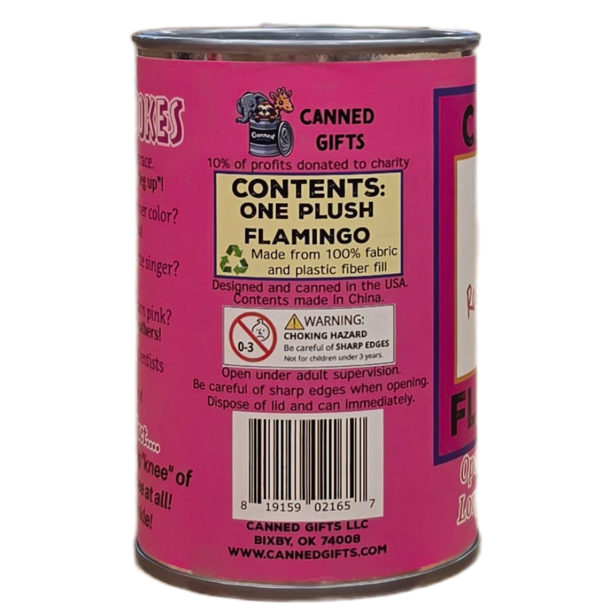 • Rosy the Canned Flamingo. 1 plush flamingo sealed in a tin can. Use a can opener to open this fun gift!