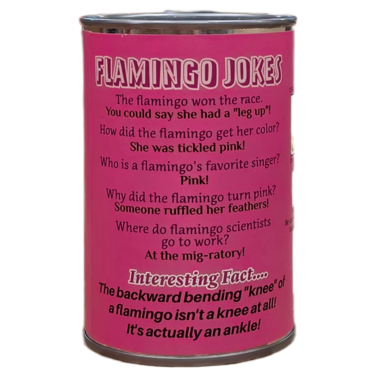 • Funny flamingo jokes and an interesting fact on the can.