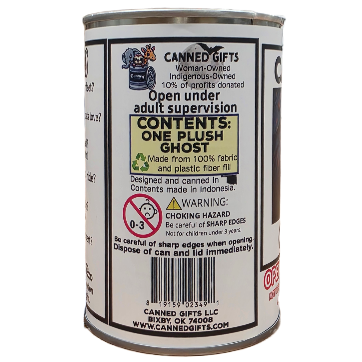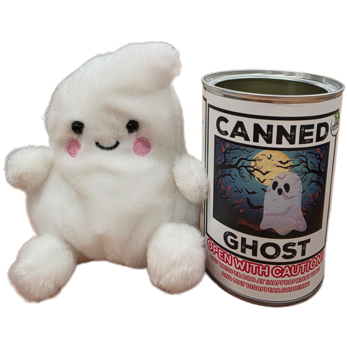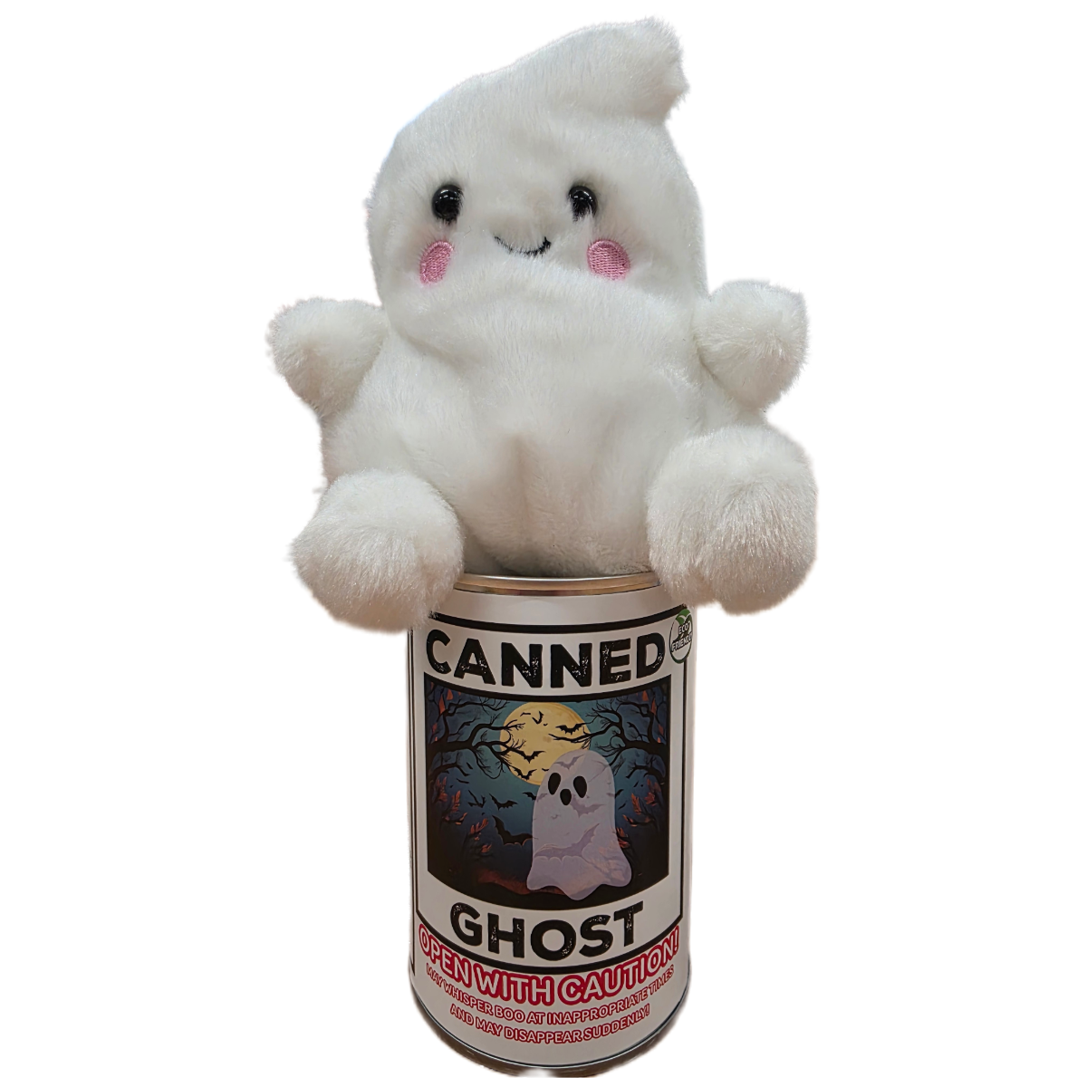 • Ghost plush sealed in a can. Your choice of lid style: regular, pop top, or foil lid.