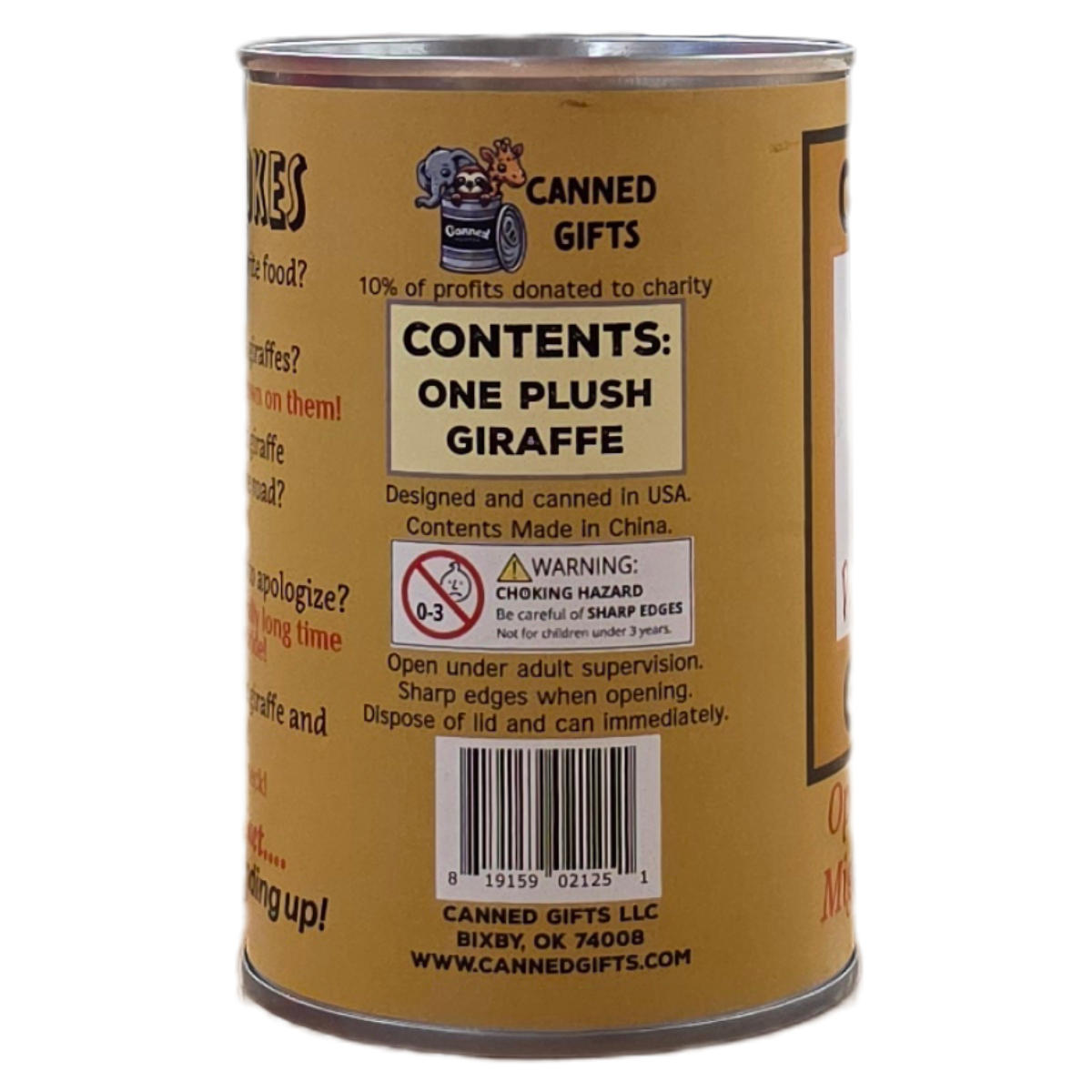 • Plush Giraffe sealed in a can. Use a can opener to open the fun gift or choose a pop top lid!
