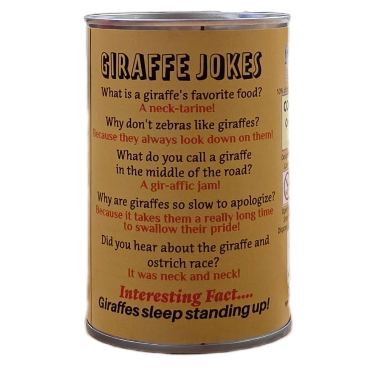 • Funny giraffe jokes and an interesting fact on the can.