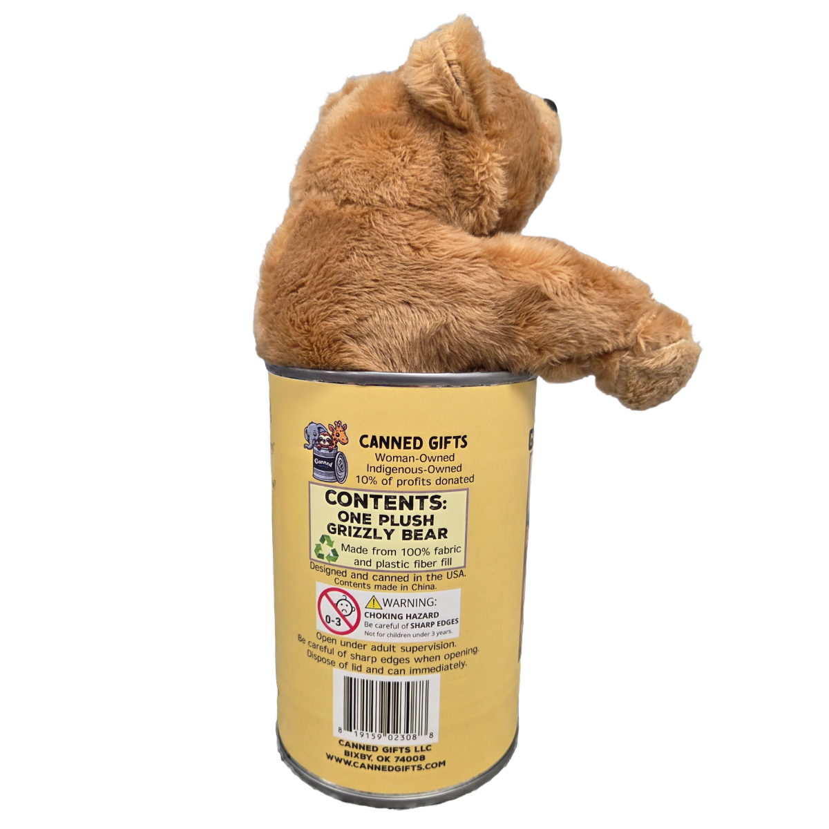 • Grizzly bear plush sealed in a can. Choose your lid style: standard, pop top, or foil.
