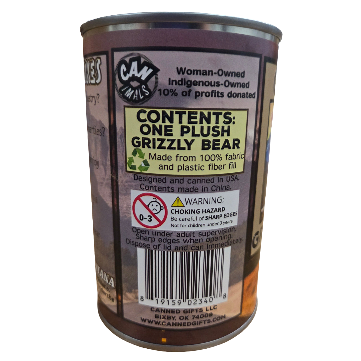 • Plush grizzly bear sealed in a can. Your choice of lid style: regular, pop top, or foil.