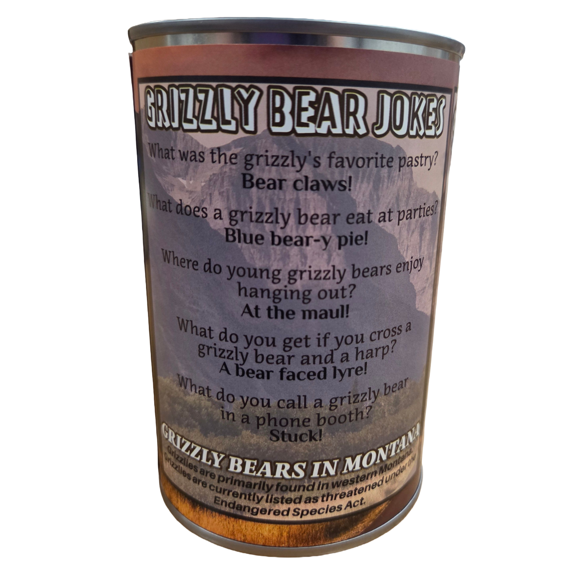 • Funny bear jokes and interesting facts about Montana Grizzlies on the can.