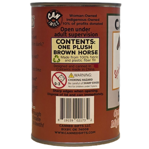• Horse plush sealed in a can. Use a can opener to open the fun gift or choose the pop top lid!