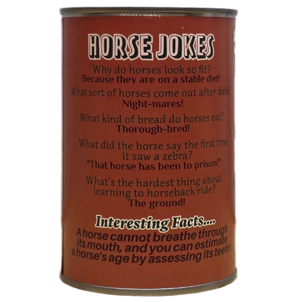 • Funny horse jokes and an interesting fact on the can.