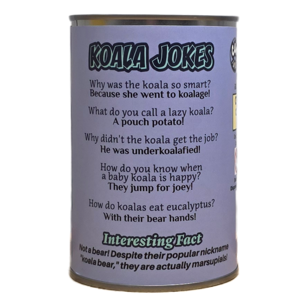 • Funny kaola jokes and an interesting fact on the can.