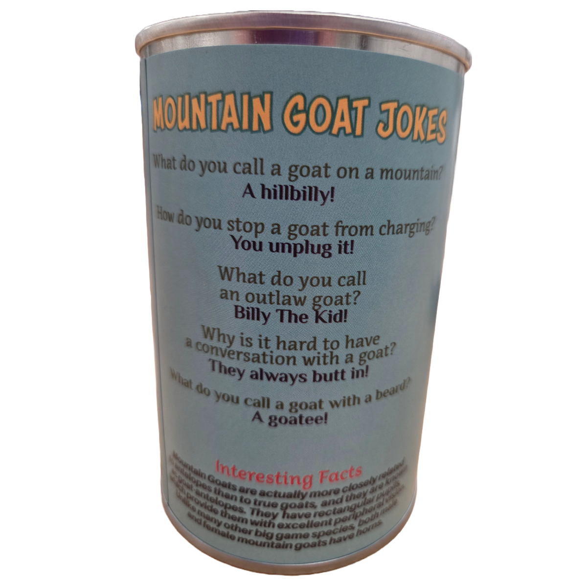 • Funny mountain goat jokes and interesting facts on the can.