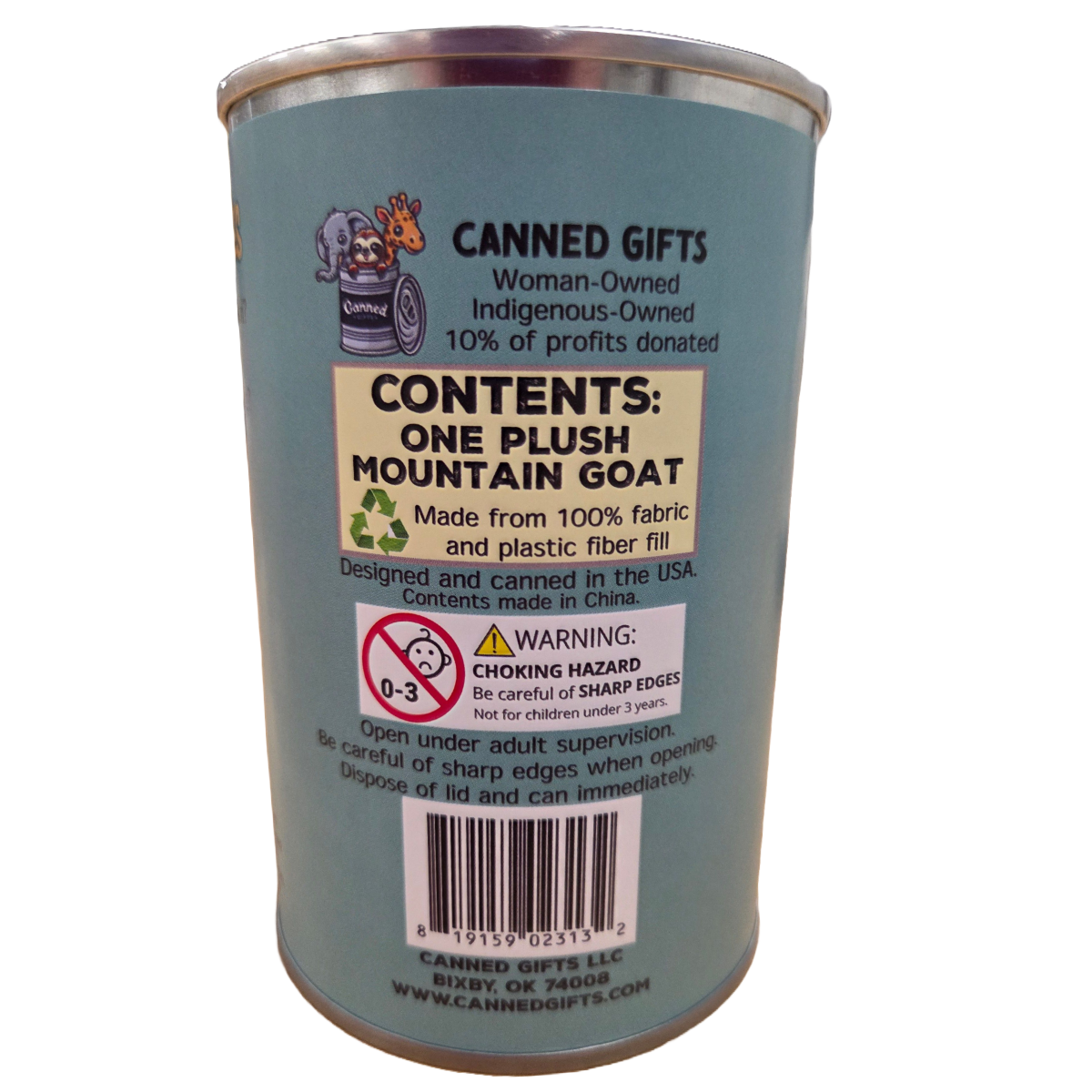 • Mountain goat plush sealed in a can. Choose your lid style: standard, pop top, or foil.