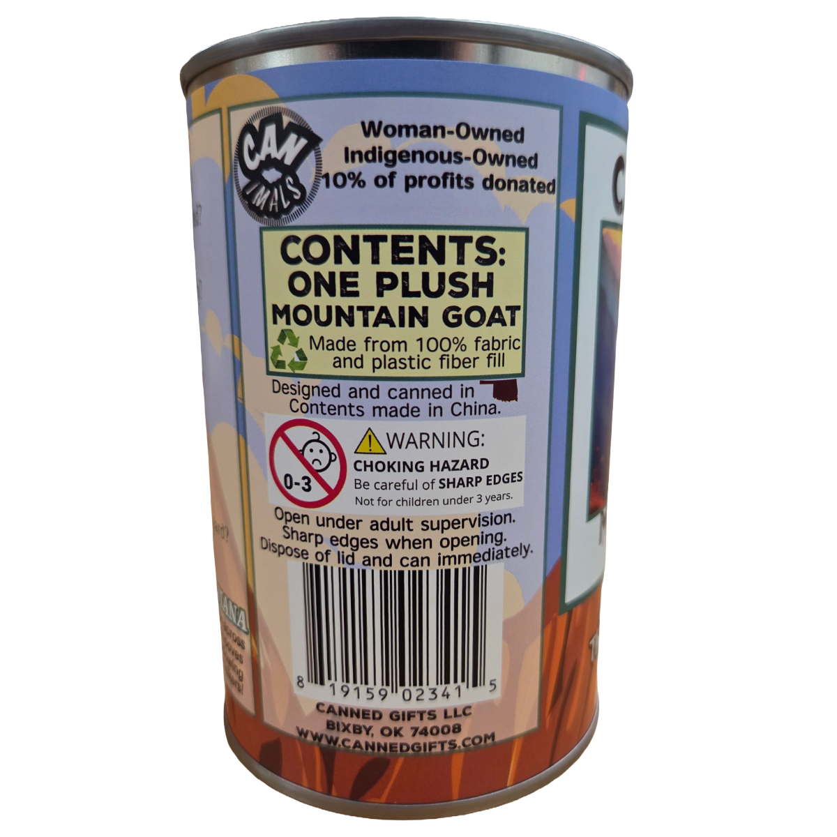 • Plush mountain goat sealed in a can. Your choice of lid style: regular, pop top, or foil.