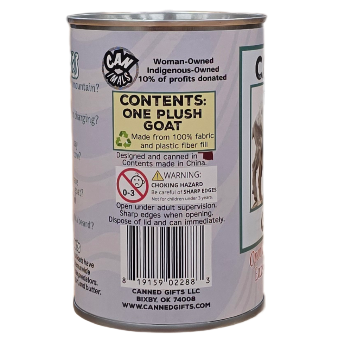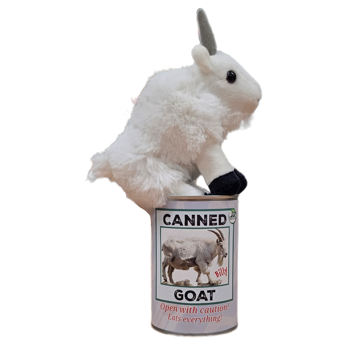 • Goat plush sealed in a can. Choose your lid style: standard, pop top, or foil.