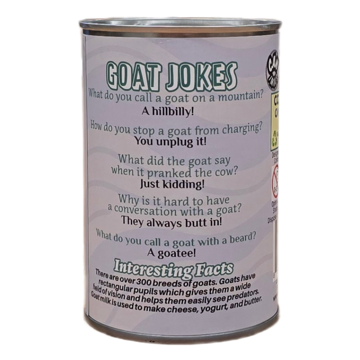 • Funny goat jokes and interesting facts on the can.
