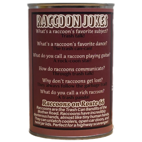 • Funny raccoon jokes and an interesting fact about Raccoons Along Route 66 on the can.