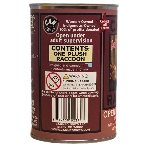 • Raccoon plush sealed in a can. Your choice of lid style: regular (open with a can opener), pop top, or foil lid.