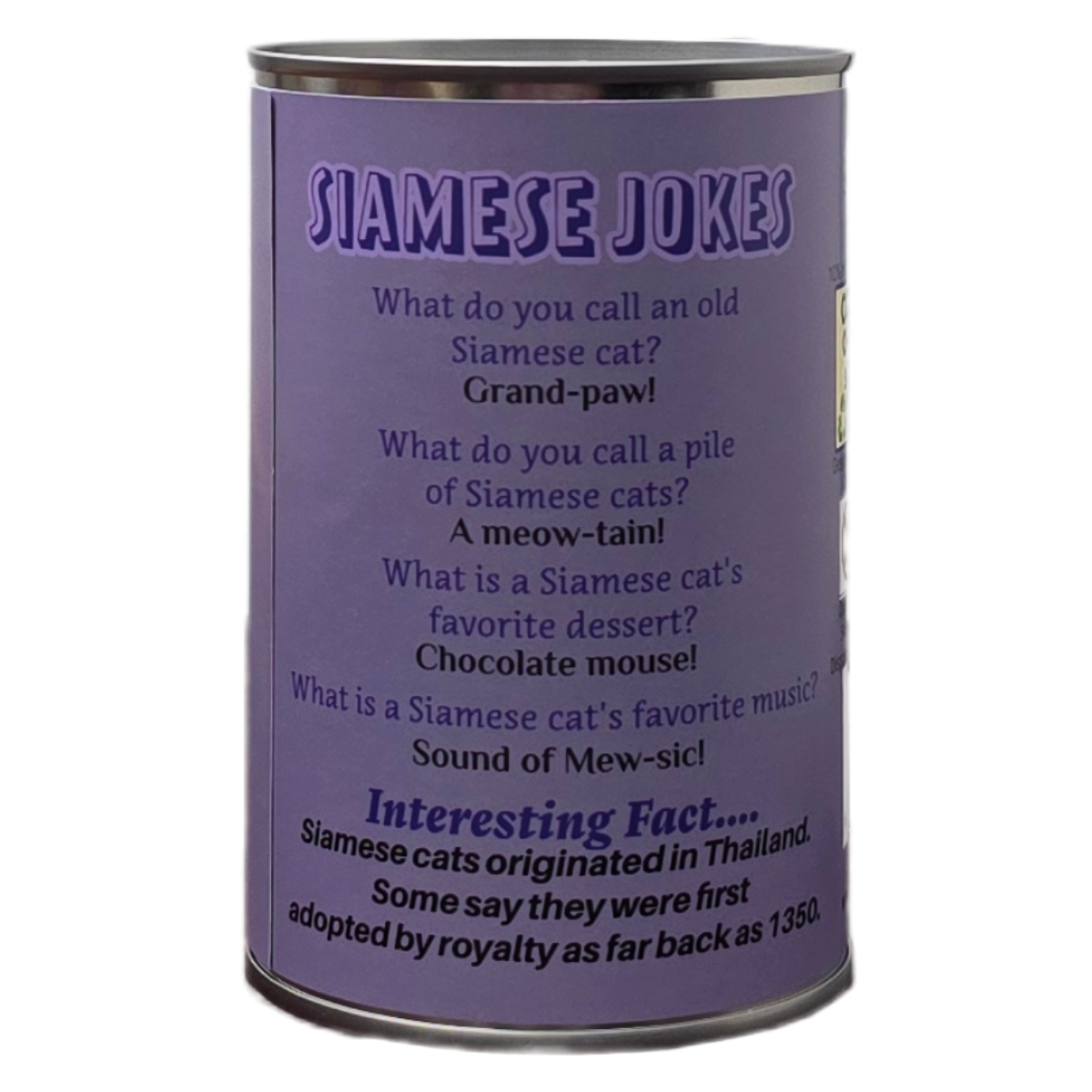 • Funny Siamese cat jokes and an interesting fact on the can.