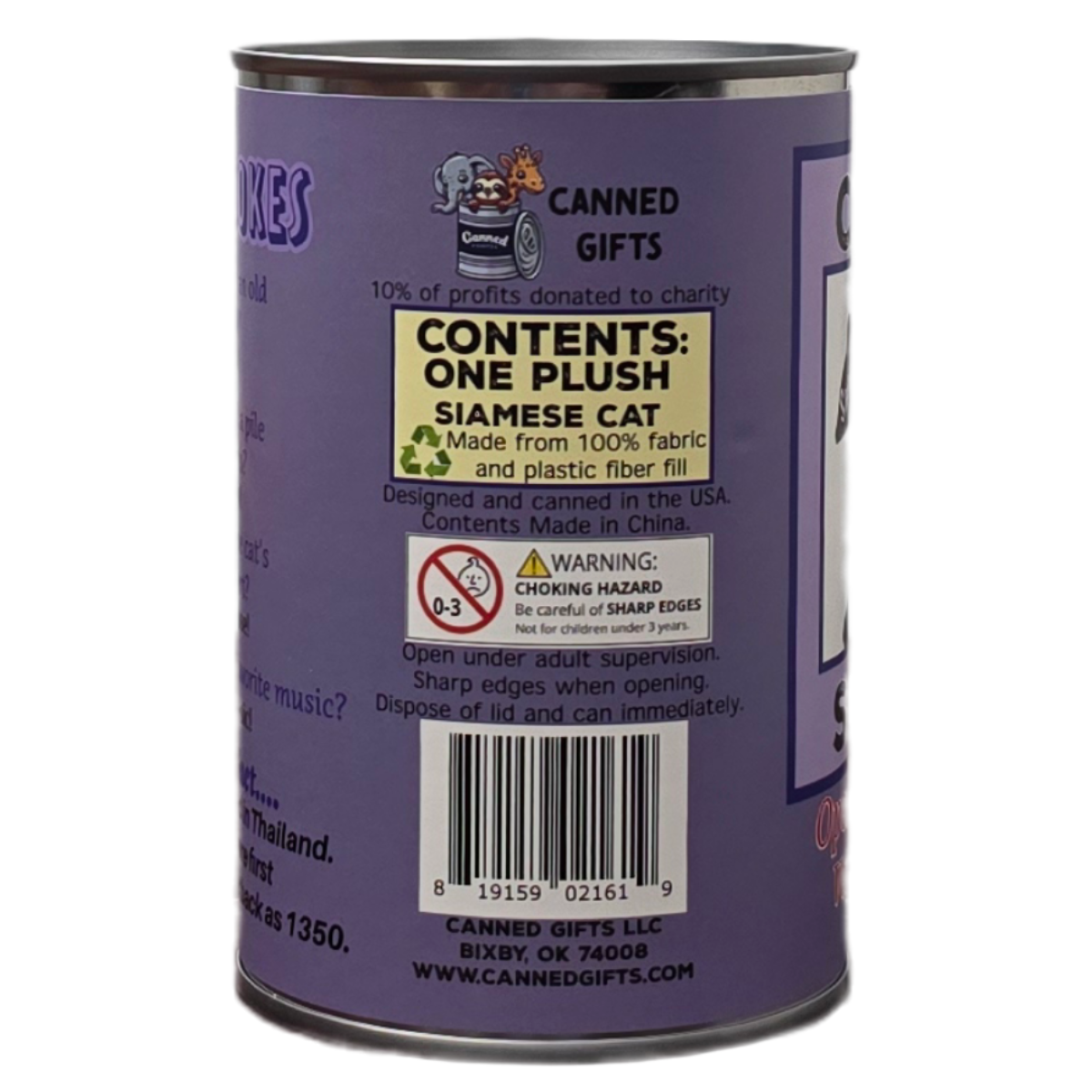 • Siamese cat plush sealed in a can. Use a can opener to open the fun gift or choose a pop top lid!