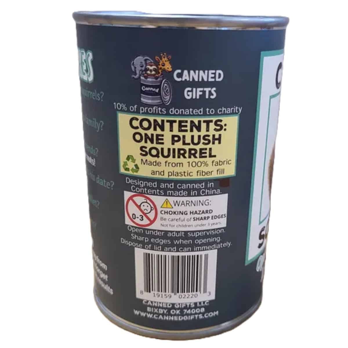 • Squirrel plush sealed in a can. Use a can opener to open the fun gift or choose the pop top lid!