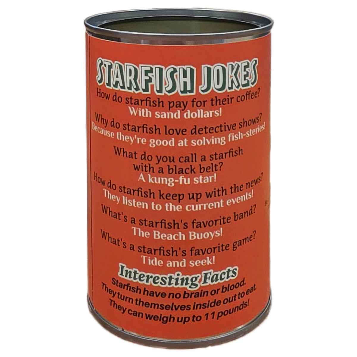 • Funny starfish jokes and an interesting fact on the can.