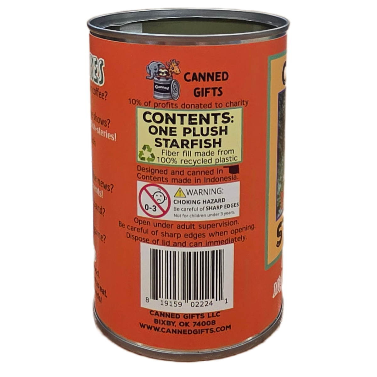 • Starfish plush sealed in a can. Use a can opener to open the fun gift or choose the pop top lid!