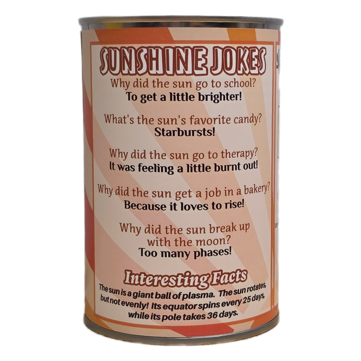 • Funny sunshine jokes and interesting facts on the can.