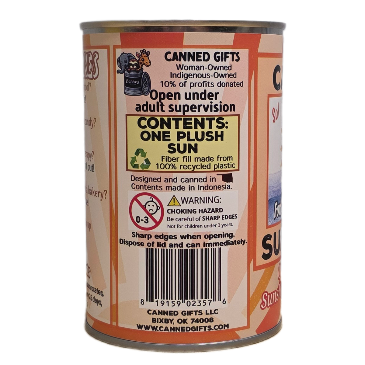 • Sunshine plush sealed in a can. Your choice of lid style: pop top, foil, or standard (open with a can opener)!
