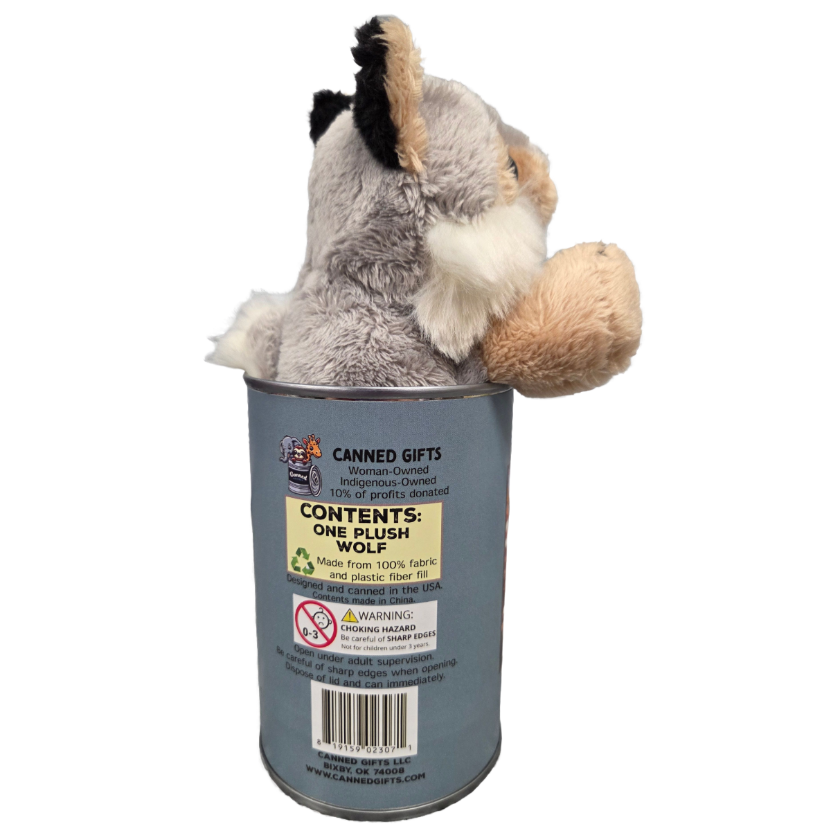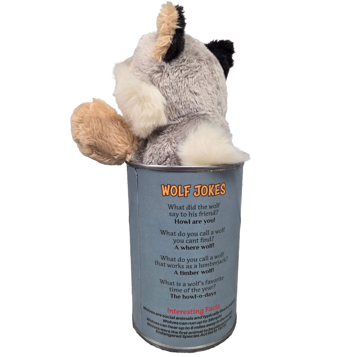 • Wolf plush sealed in a can. Your choice of lid style: standard, pop or foil.