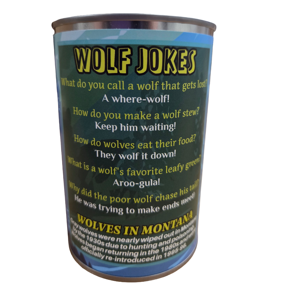 • Funny wolf jokes and interesting facts about the Montana Wolf on the can.